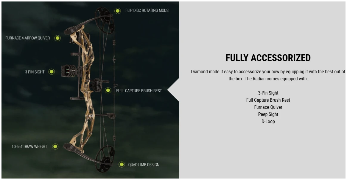 Meet the Diamond Radian—lightweight, stylish, and built to grow with you. Weighing just 2.9 lbs., it’s easy to handle and packed with premium features, including a rigid caged riser, ultra-wide quad limbs, and extreme adjustability in both draw length and weight. Whether you’re a youth stepping up or an adult looking for value without compromise, the Radian delivers stability, durability, and serious performance in a ready-to-shoot package that outpaces its price.