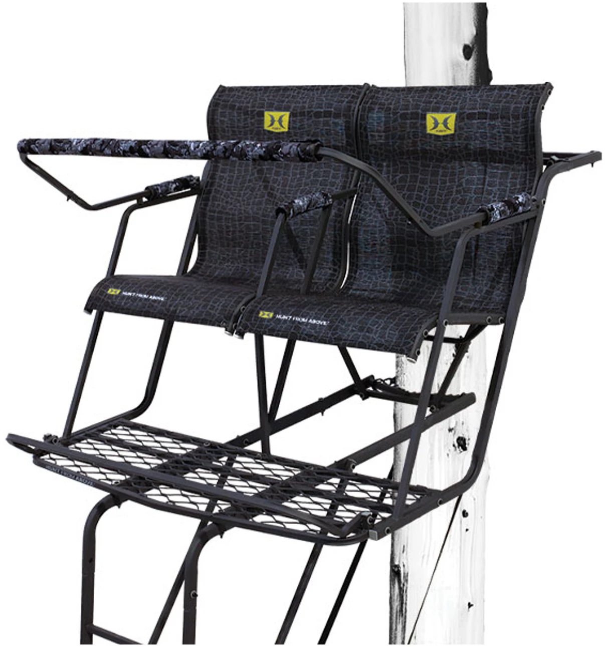 Hunting with two people in one treestand has never been this comfortable. Two Padded MeshComfort™ Seats are an extra-large 24” wide with a 23” high contoured backrest – this type of lounger has only been found on patio furniture until now! An extremely spacious 51”x17” platform ensures the ultimate in security for you and your hunting partner. Heavy duty oval tubing, bolted sections and exclusive tensioning system make this stand rock-solid. Includes Integrated Footrest, Flip Back Shooting Rail and Centered Arm Rest.