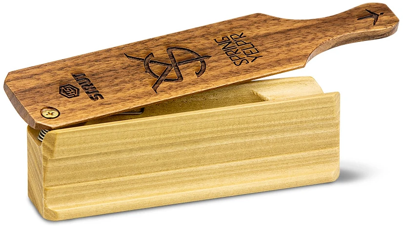 The Spring Yelp’R Box Call is a unique box. Besides its construction of American poplar and walnut, it is a one-sided call with a unique spring design. The spring is a compression/torsion spring. It not only controls the tuning by way of screw depth but also allows the user a one-handed foolproof operation. Help open in place, one only must stroke, tap or slide to get all kinds of vocalizations from yelps, cuts, clucks, whines, and purrs. Automatically returning to home base each time.