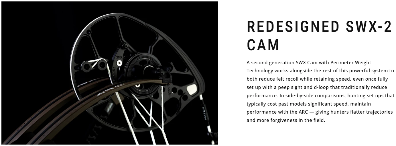 Engineered for speed and refined for archers who demand more, the 2026 ARC™ combines enhanced stability, efficiency, and versatility in a lightweight, high-powered platform. Built on our most advanced riser design to date, the new SWX-2 Cam with perimeter weight technology, and a redesigned limb cup and limb geometry, every system within the ARC platform has been scrutinized to retain velocity across hunting setups.