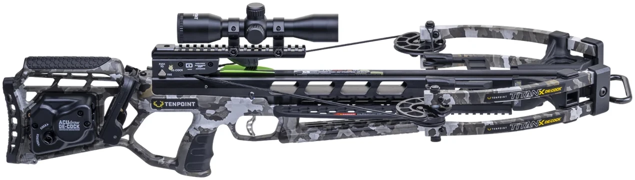Featuring safe, silent, tangle-free crank de-cocking combined with category-leading accuracy and a narrow front-end known for incredible reliability, the Titan X delivers more features than ever before, defining the ultimate value crossbow with its newly designed stock and barrel configuration, lighted scope, and 400 FPS performance while maintaining the Titan’s legendary durability, reliability, and accuracy as a top-selling crossbow.