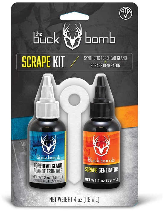 The Buck Bomb Scrape Kit includes both the 2oz Scrape Generator scent as well as the 2oz Synthetic Forehead Gland, a deadly combination for attracting bucks throughout the rut. Forehead Gland imitates the scent that comes from the forehead of a buck when he makes a rub, while Scrape Generator utilizes both Doe ‘n Estrus and BucRut scent to create the situation of a hot doe and buck in the area.