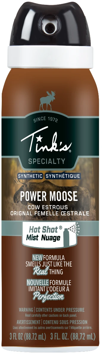 Tink’s® Power Moose Hot Shot® Mist is a synthetic lure formulated to smell like fresh cow urine at the peak of their breeding cycle. Recommended use is in a real or mock wallow, or rut pit. Hot Shot® Mist works well sprayed in the air, allowing it to float downwind.