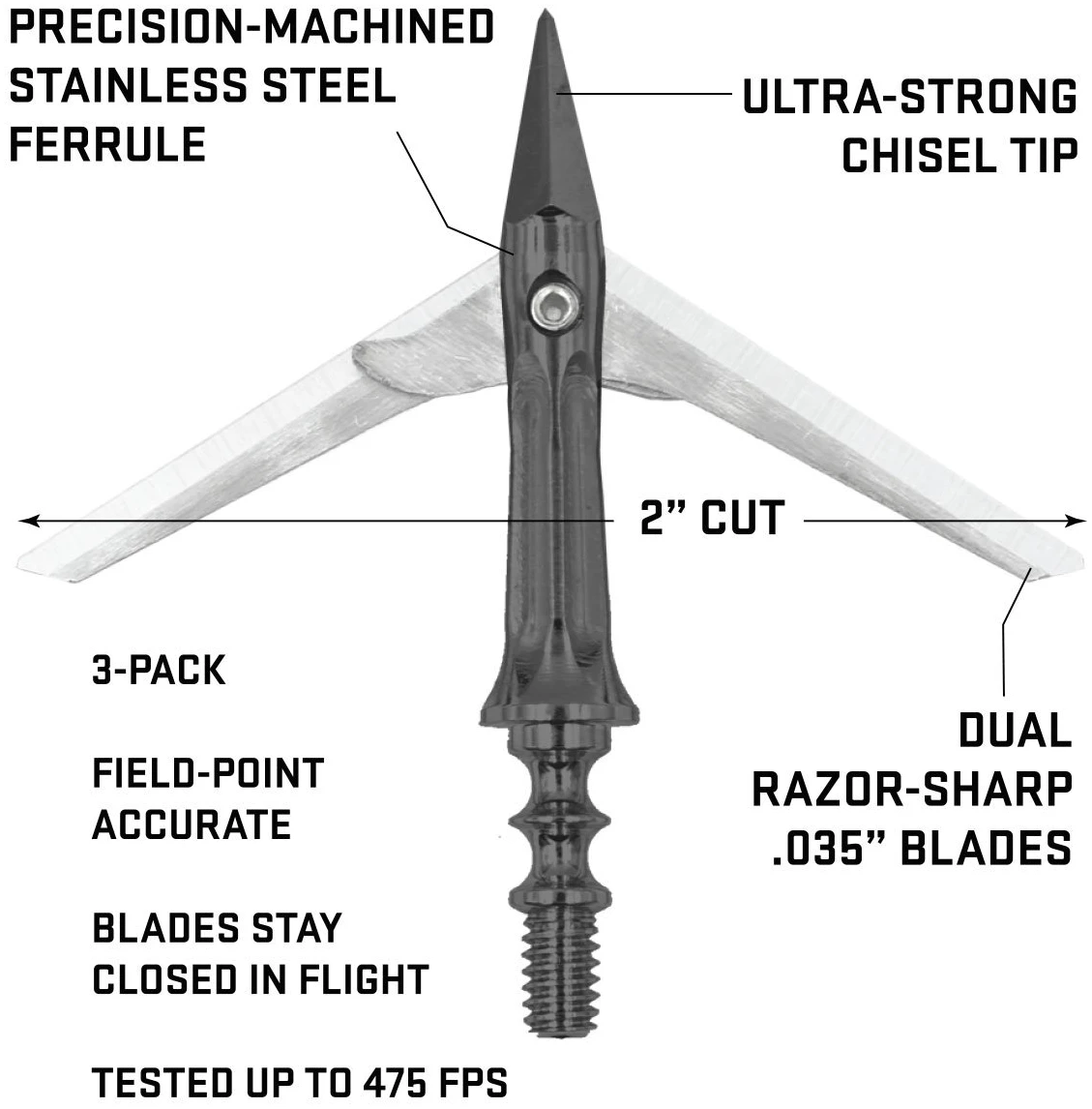 Designed for precision, durability, and performance at a great value, the 100-grain, 2-blade, rear-deploying Impact crossbow broadhead features a steel construction and a simple, collarless design that delivers field point accuracy and a devastating 2” cut.